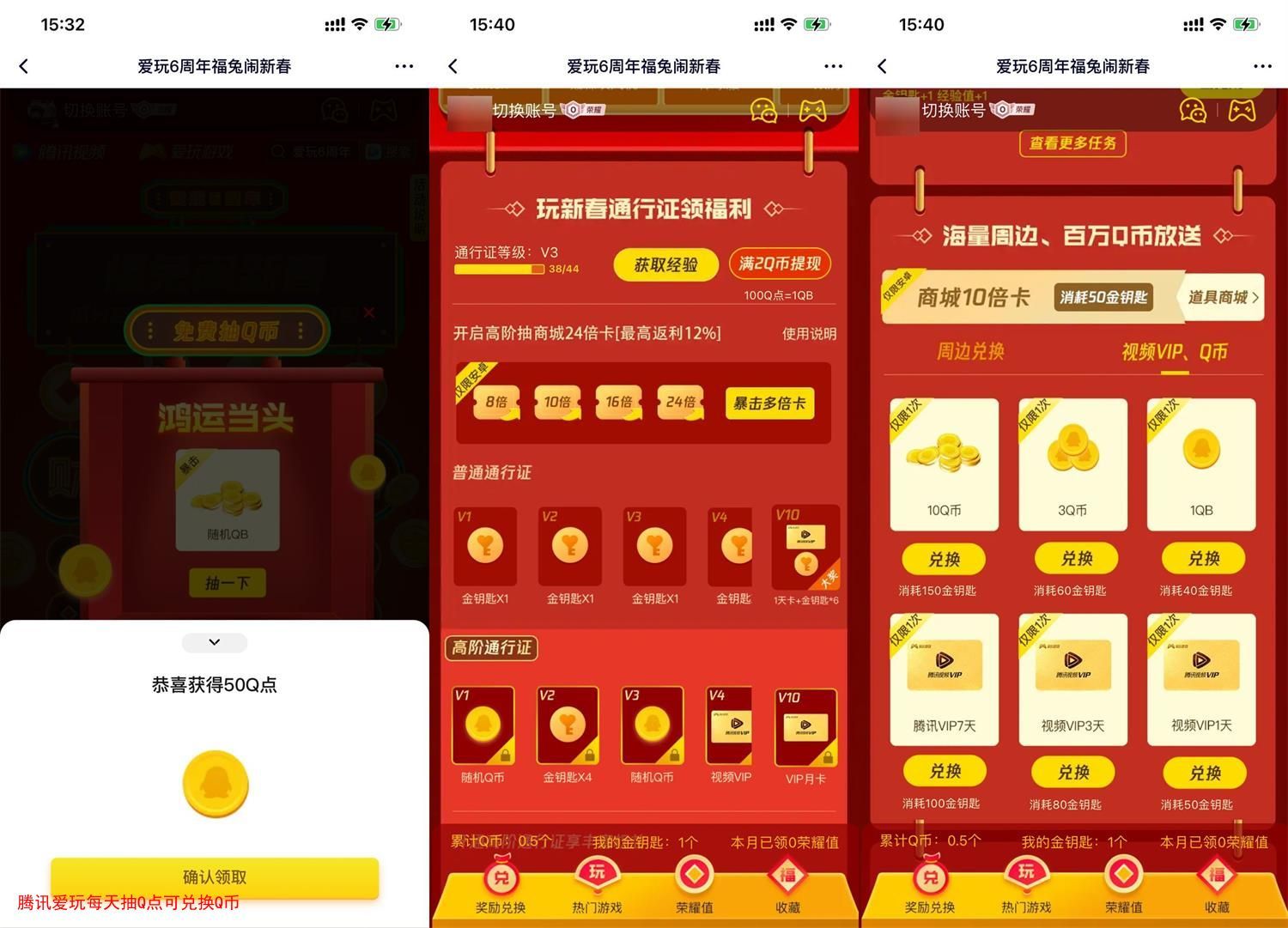打开地址->每天弹窗抽Q点,每100Q点兑换1Q币->每天简单任务得金钥匙,累计金钥匙兑换Q币或腾讯视频会员