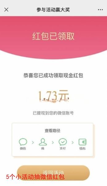 第1个活动许愿后打开直接抽奖,第2个活动阅读全文参与,第3个活动全选多包,第4个活动小游戏后抽奖,第5个活动直接抽奖。(非必中)