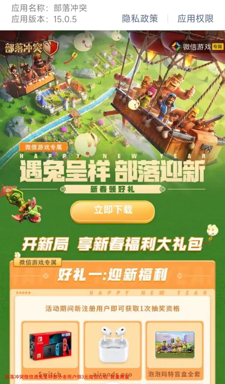 部落冲突微信遇兔呈祥部分老用户领3元微信红包 数量限量