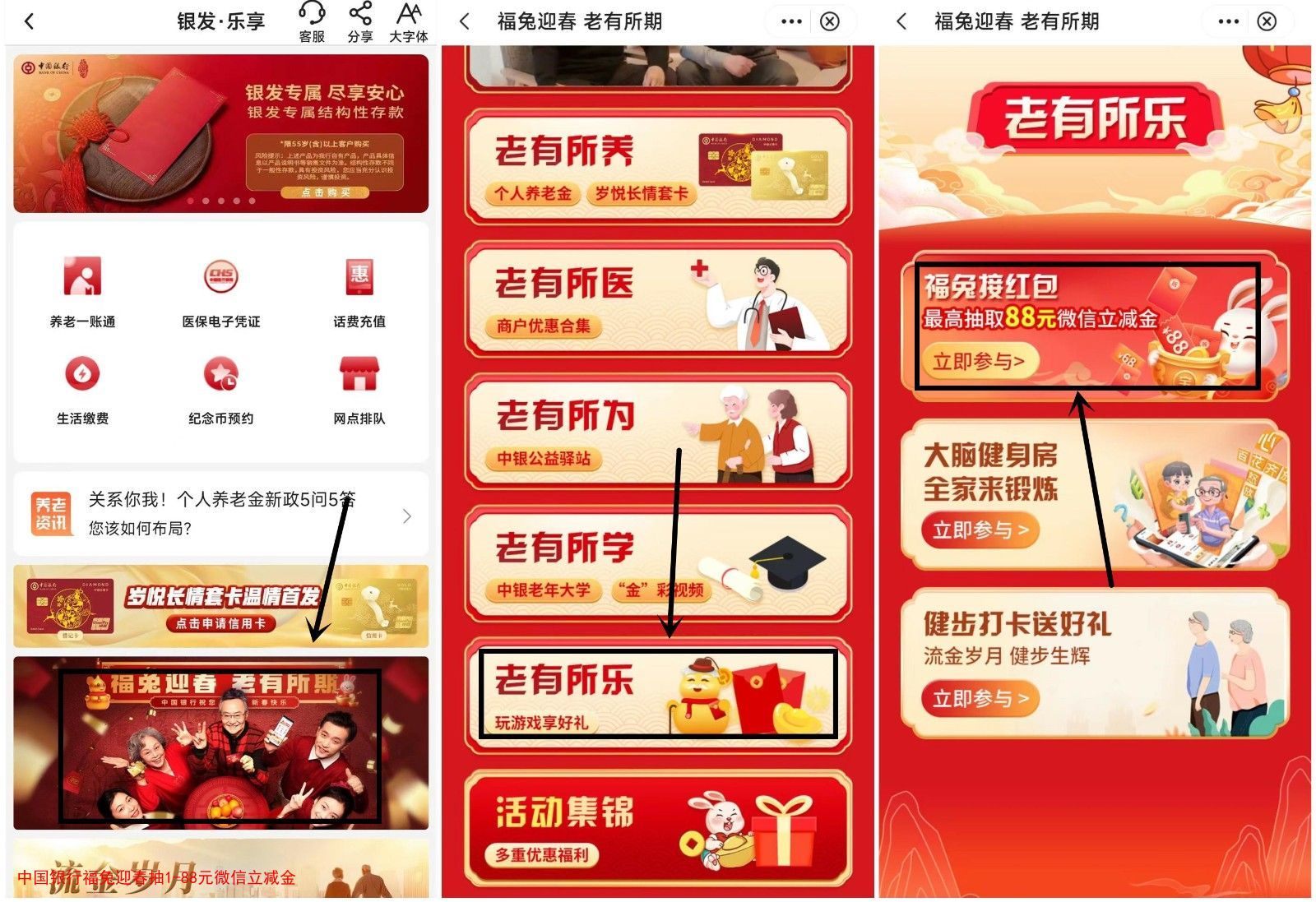 打开中国银行APP搜索【银发专区】进入,“福兔迎春”-【老有所乐】进入