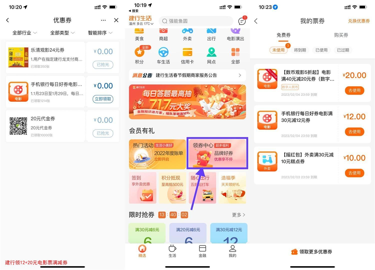 建行领12+20元电影票满减券