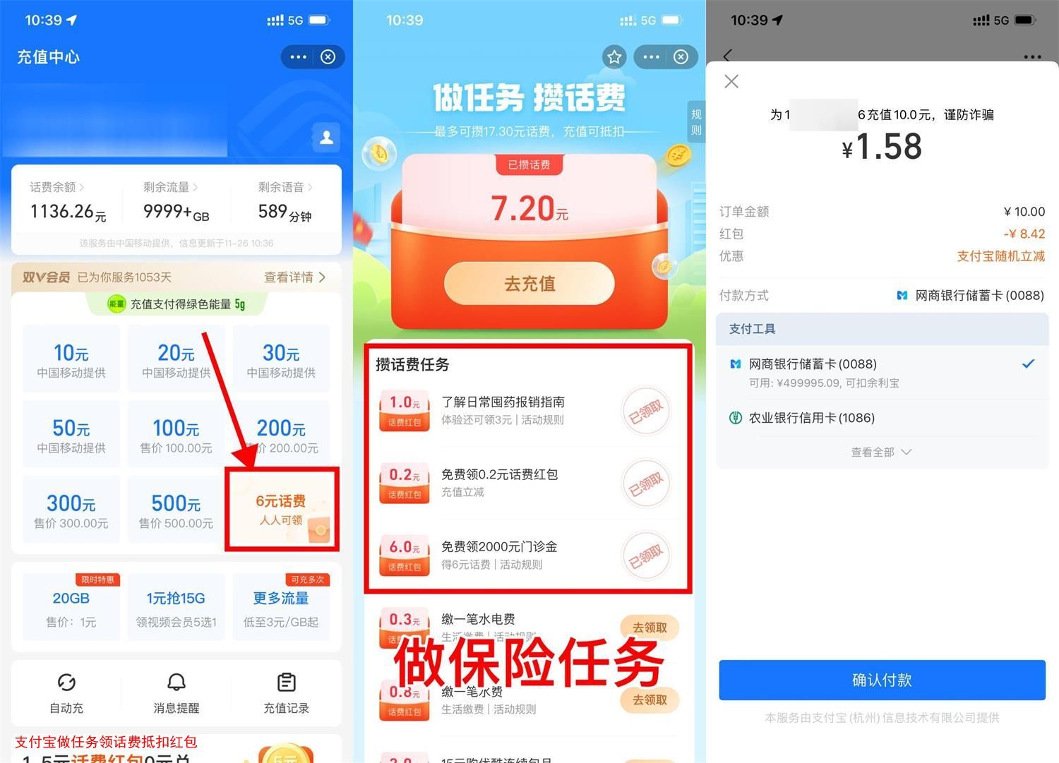 支付宝做任务领话费抵扣红包