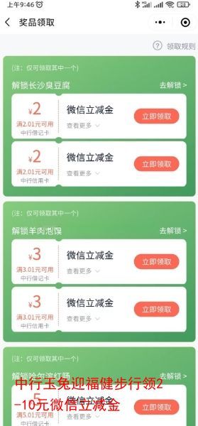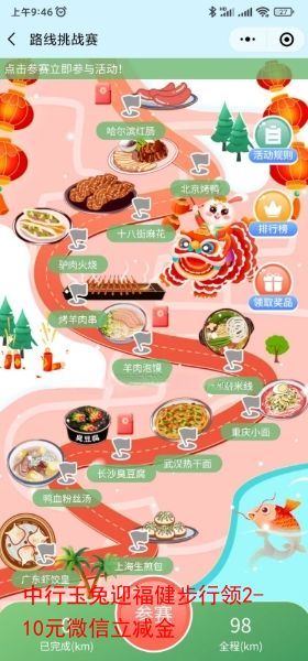 中行玉兔迎福健步行领2-10元微信立减金,进入活动后报名参赛,完成指定里程后分别领2元+3元+5元微信立减金,每个档位的立减金活动数量限量