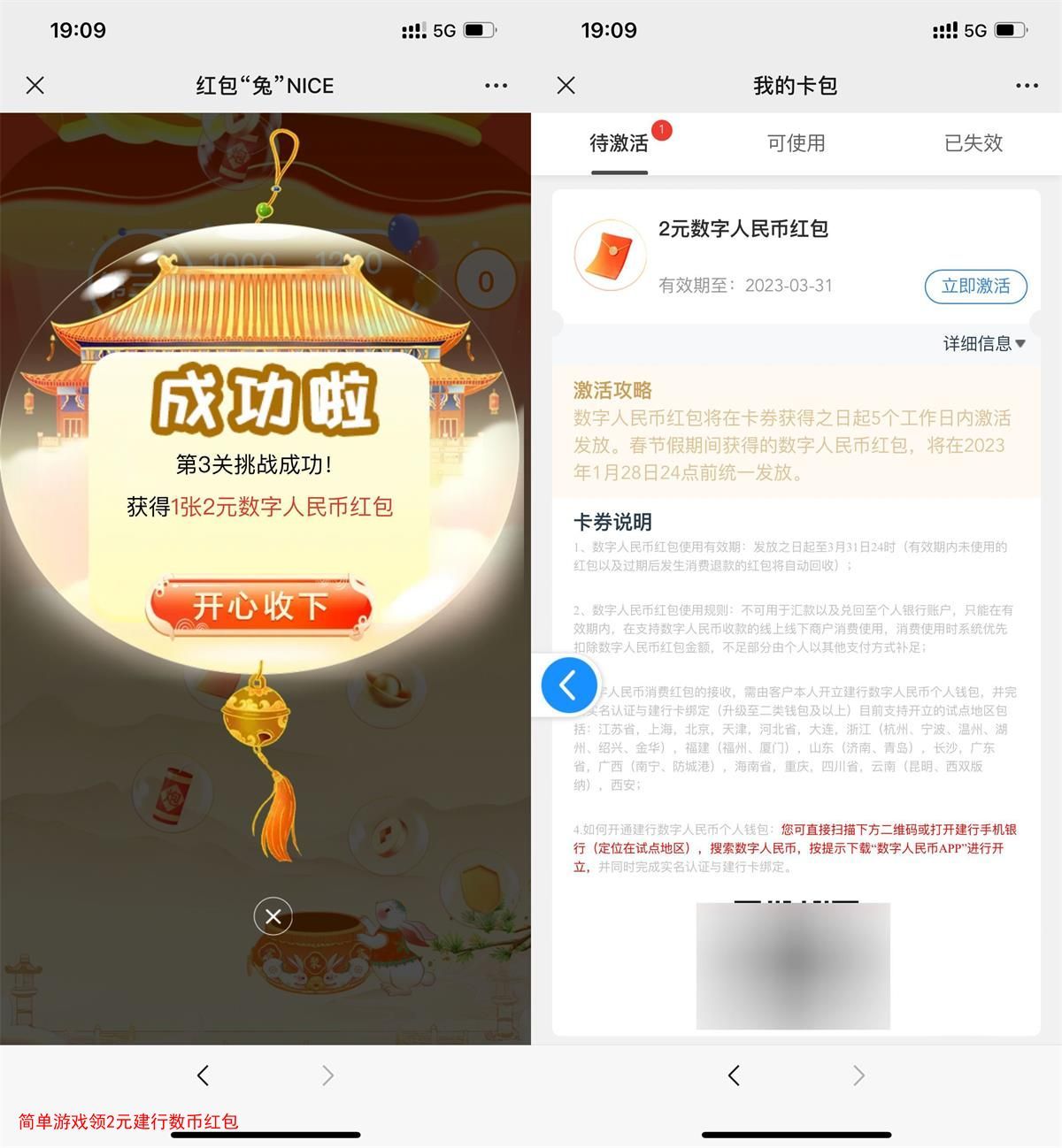 微信打开地址->玩游戏通过3关->自动领取2元建行数币通用红包,5天内自动到