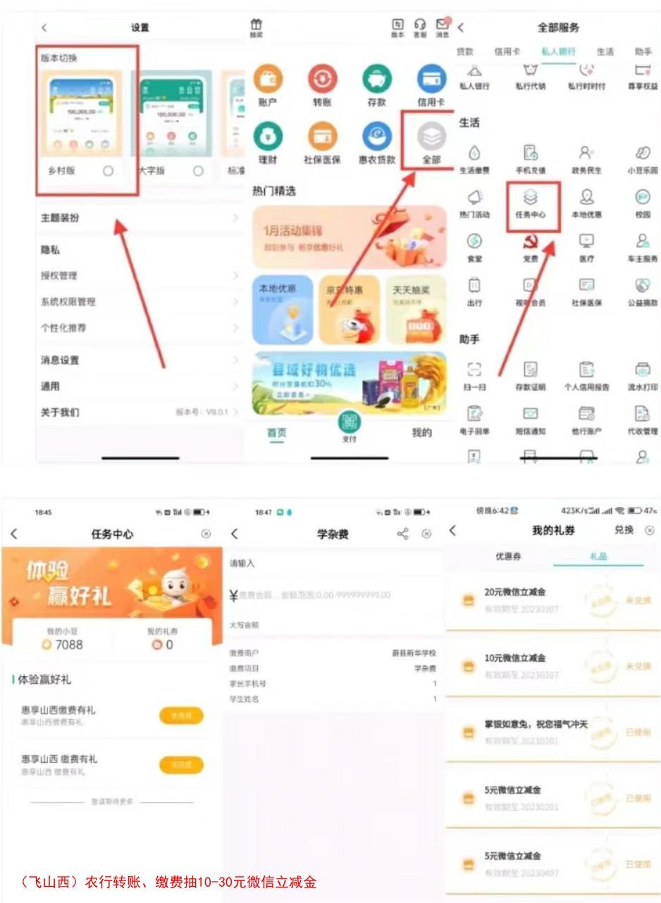 3、农行APP--我的--设置--切换【乡村版】在首页【全部】-【任务中心】可以看到2个缴费有礼活动