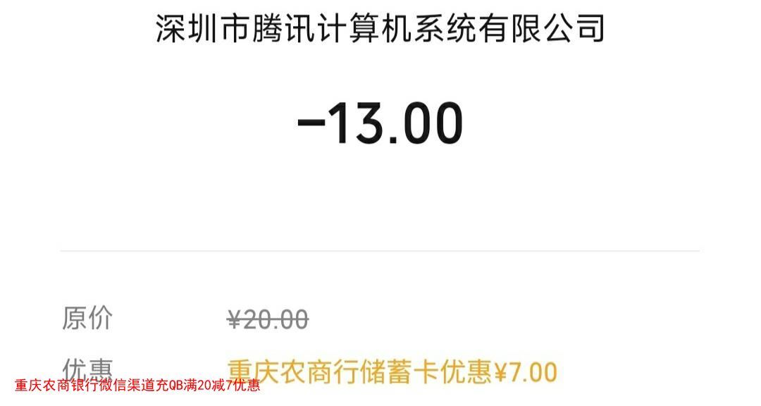 重庆农商银行借记卡(含电子)用户,微信服务充值QB满20减7优惠,单用户单月限3次。可海鲜市场出别人9折左右,号内88折左右。优惠数量有限,先到先得。