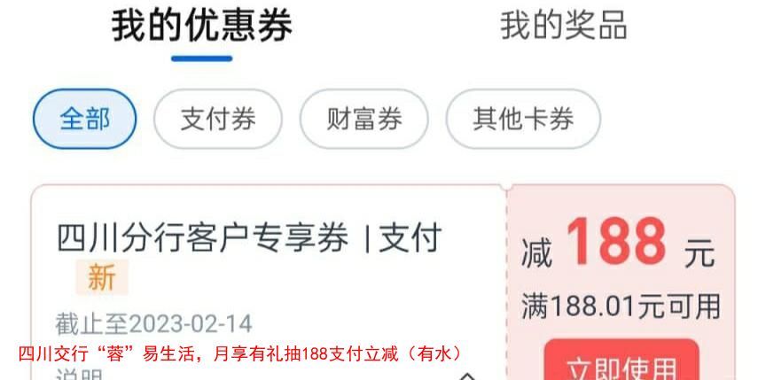 四川交行“蓉”易生活,月享有礼抽188支付立减(有水)