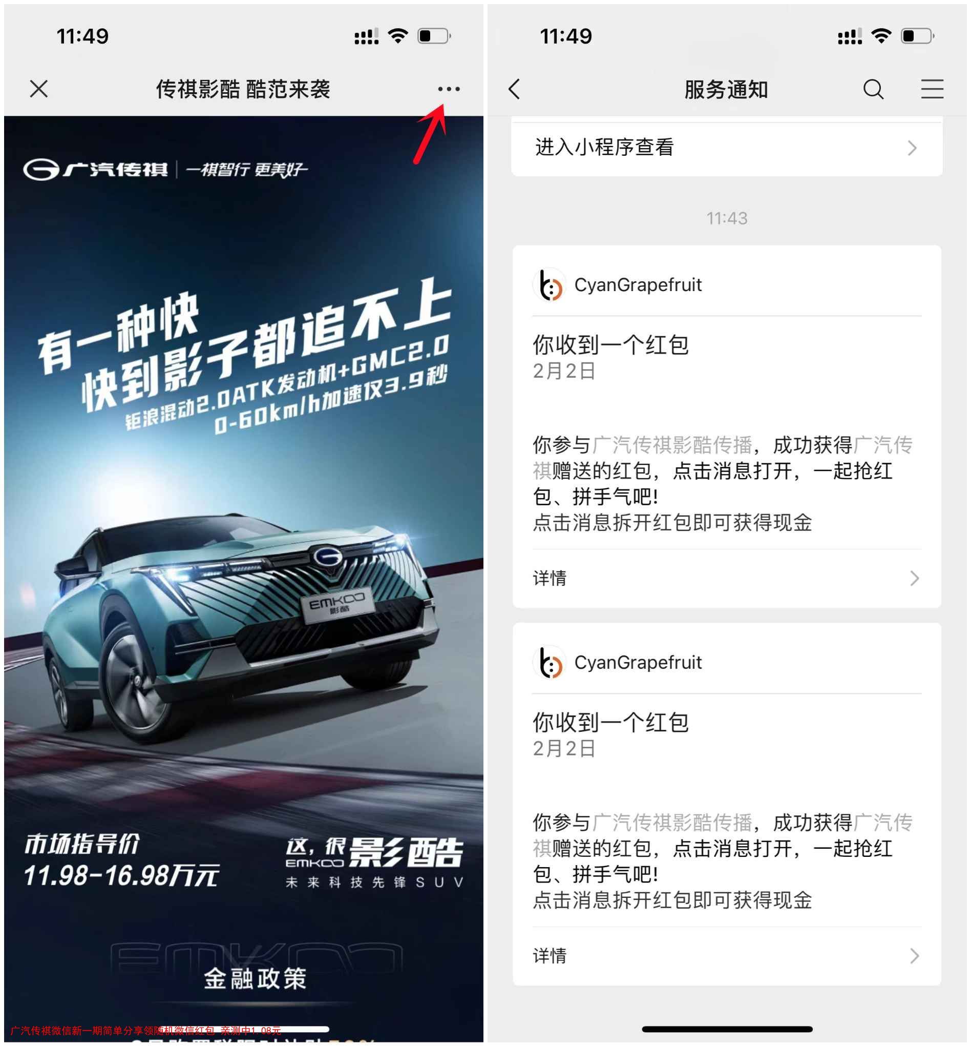 广汽传祺微信新一期简单分享领随机微信红包 亲测中1.08元