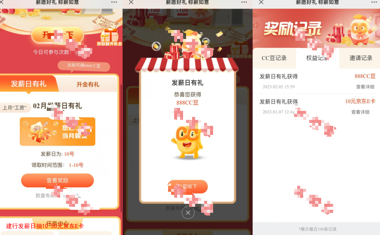 新一期,限建行工资卡用户参与!微信打开地址->设置发薪日为10号->直接抽10~50元京东E卡或666~888CC豆,京东E卡在“建行APP-我的-卡券”中查看,CC豆可兑换猫超卡或美团券等