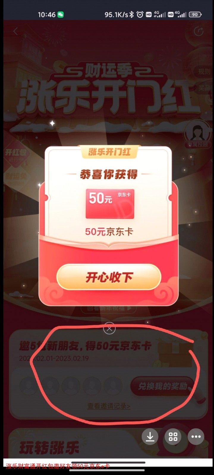 活动期间客户登录涨乐财富通App主页上方,进入“开门领红包”活动,进入活动拆红包和领取邀友任务,拆红包可随机获得乐米券奖励,邀友任务要求邀请5位新朋友得50元京东e卡。
