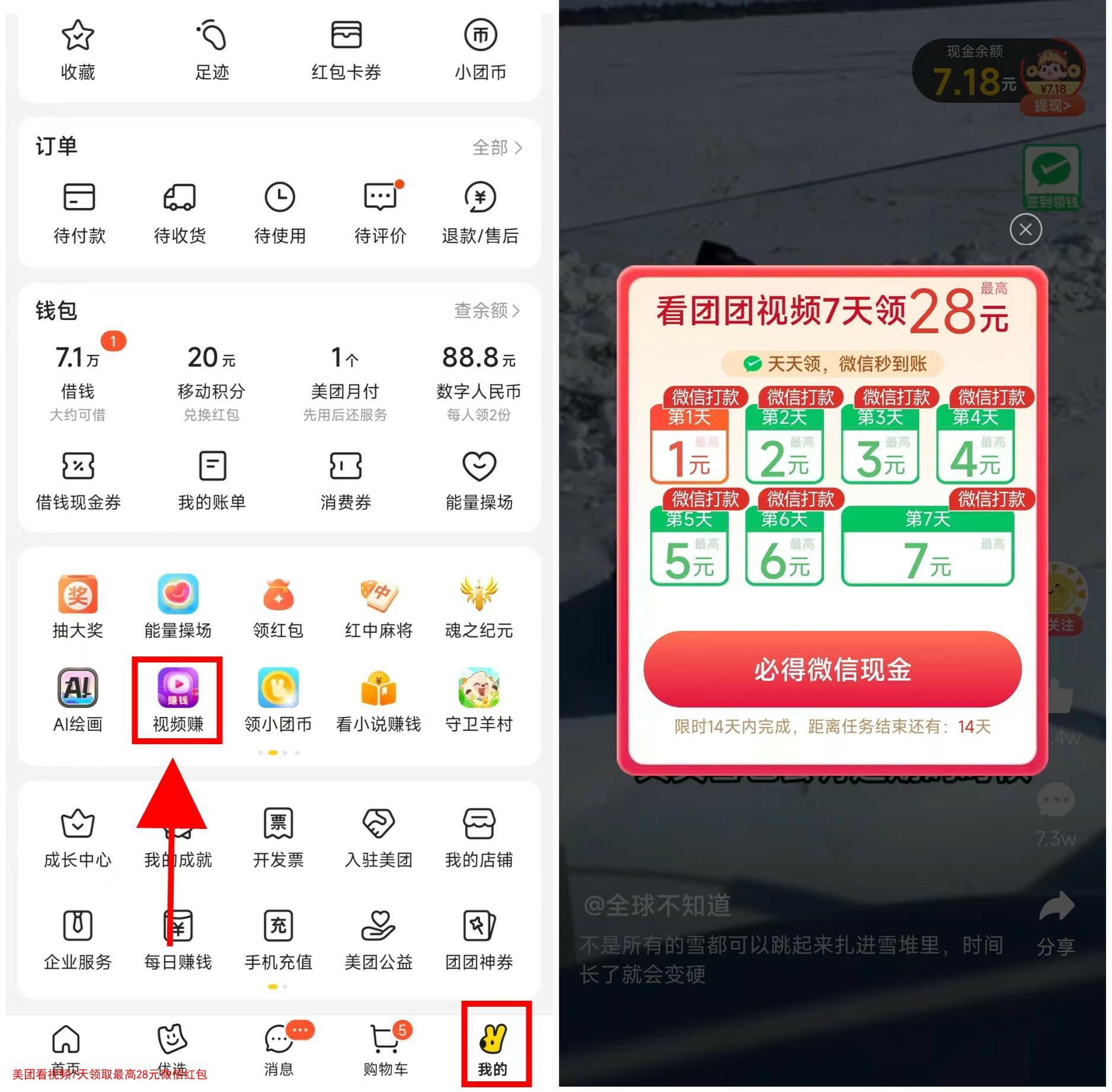 本文在美团APP里面观看视频可以获得微信红包,观看7天最高28元