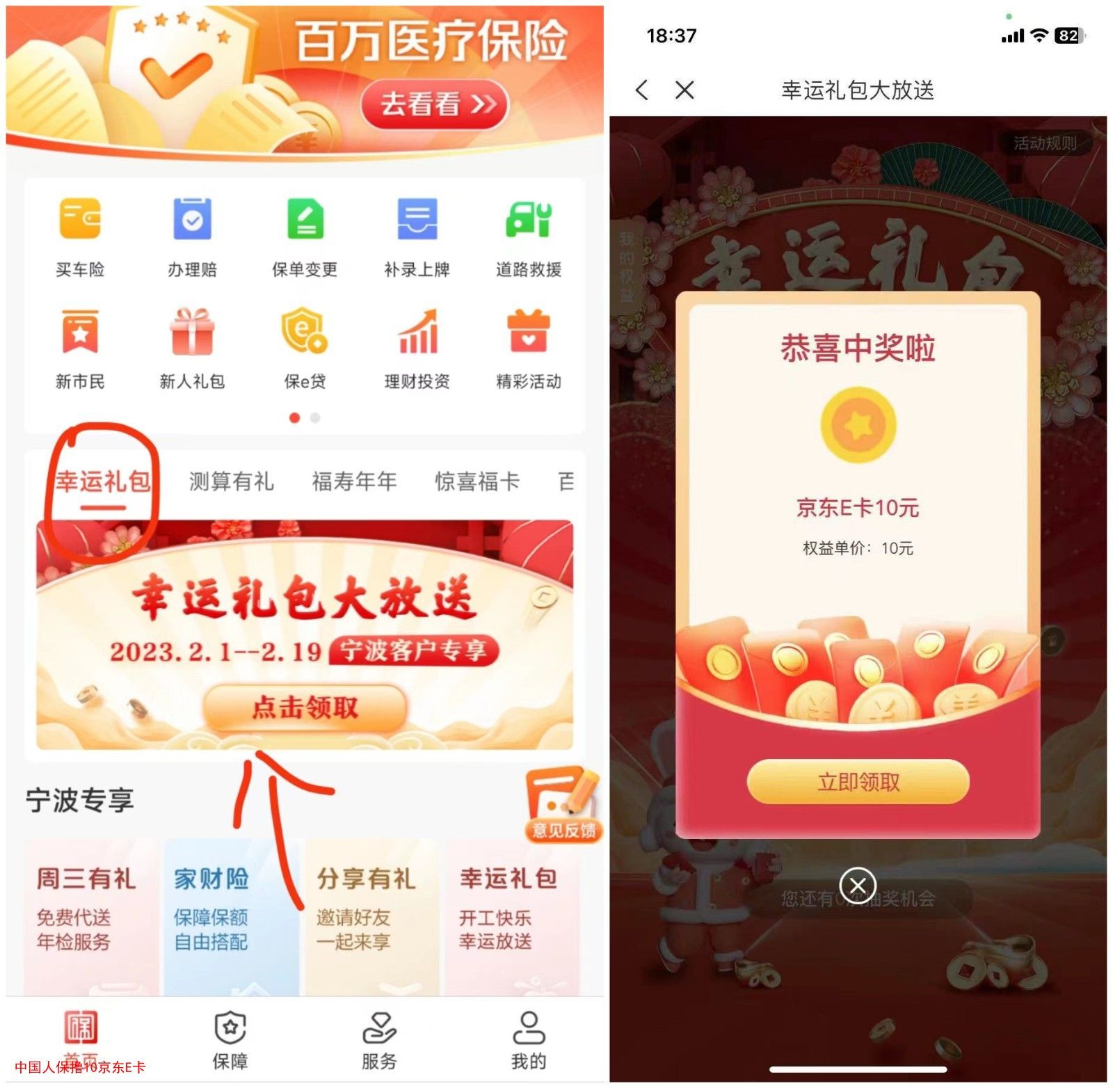 中国人保app 切城市宁波 首页——幸运礼包横幅——直接领取10e卡 (随时黄)
