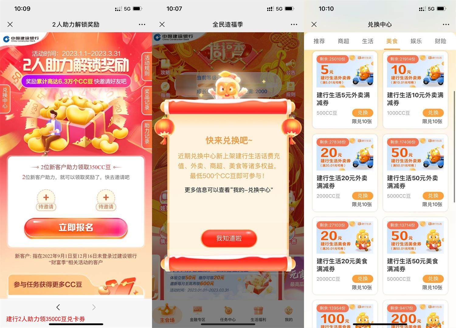 微信打开地址->邀请2个新用户助力得350CC豆(2022年9月1日~12月16日未登陆活动用户),累计500CC豆即可兑换建行生活外卖券、京东E卡、话费等