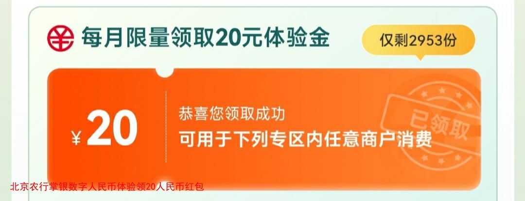 北京农行掌银数字人民币体验领20人民币红包
