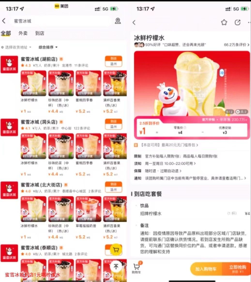 美团APP搜索“蜜雪冰城”->大部分店都有1元柠檬水->购买后到店核销自取即可