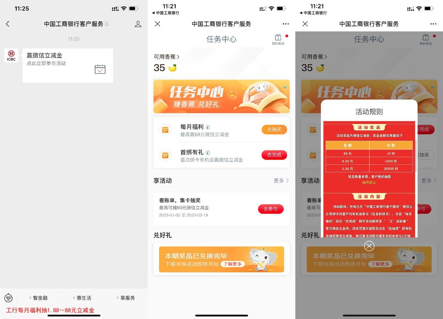工行每月福利抽1.88~88元立减金