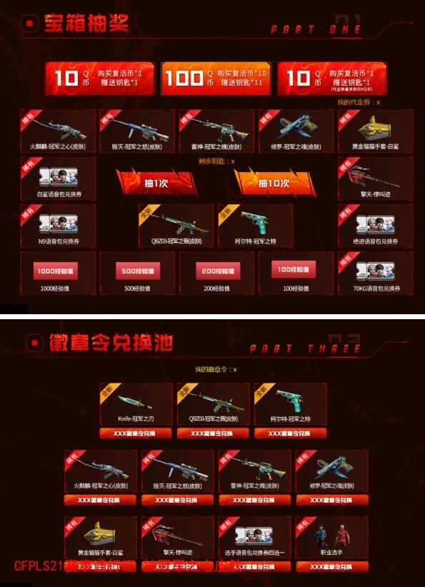 CFPLS21赛事通行证活动,参与的奖励有QBZ03-冠军之薇皮肤、柯尔特-冠军之特、Knife-冠军之刃、幻神-冠军之幻皮肤兑换券、雷神-R.LGD-CFPLS18冠军皮肤兑换券、黑龙-冠军之武皮肤兑换券、火麒麟-冠军之心皮肤、黄金猫猫手套-白鲨、擎天-惨叫迹、选手语音包兑换券、10支战队炫彩背包等