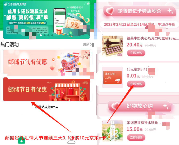 邮储好礼汇情人节连续三天0.1抢购10元京东e卡