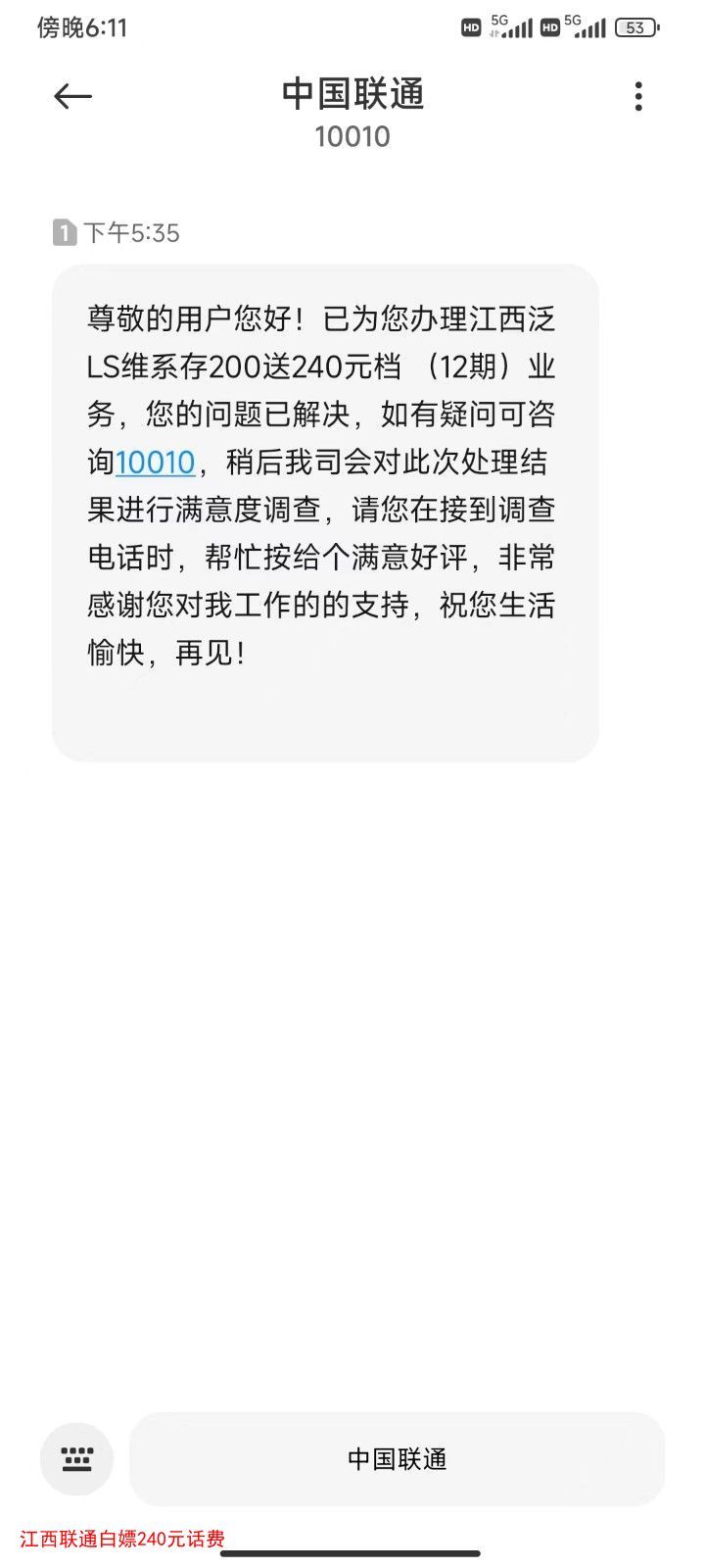 江西联通客户自己打10010说申请“江西维系存存200送240话费”,客服可能会说你不符合资格,你直接让他反馈上报。