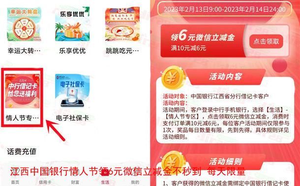 小编提示:打开中国银行APP,点底部【生活】下拉页面找到【情人节专属】进去,可以直接领6元微信立减金,只有江西中国银行用户才可以领取,每天限量,如果当天领完了可以第二天再去领
