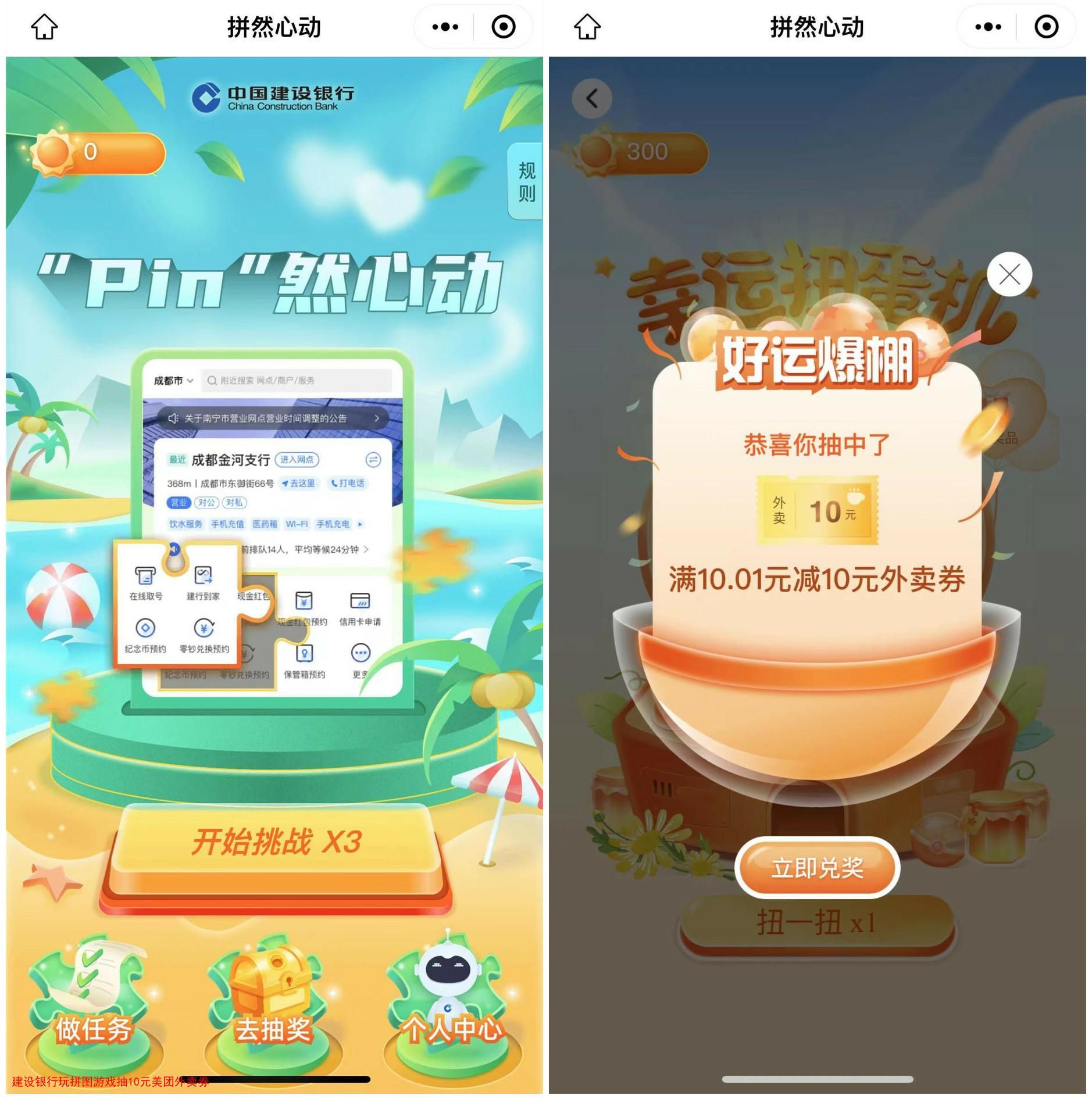 微信关注【中国建设银行掌上网点】公众号,左下角【精选活动】-【Pin然心动】进入