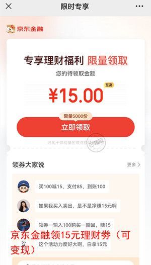 京东金融领15元理财劵(可变现)