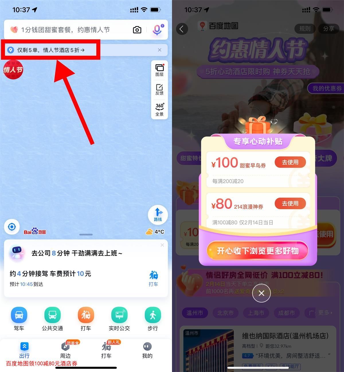 百度地图APP左上角小滚动条进入->自动弹出100减80元酒店券,今天正好要住酒店的可以领下!