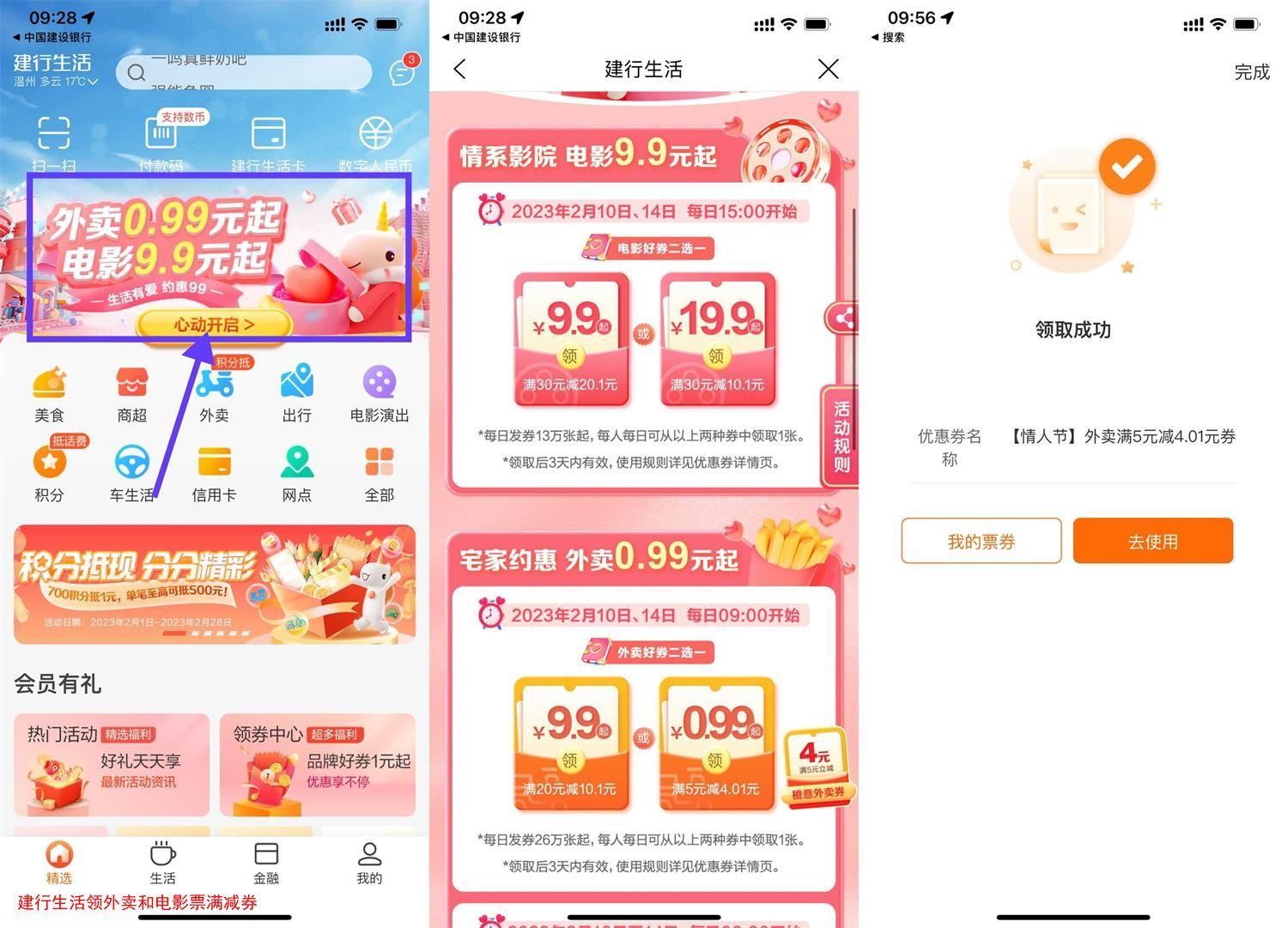 建行生活APP首页进入->领外卖满5减4元券,可叠加饿了么红包使用->下午3点领电影票满30减20元/10元券