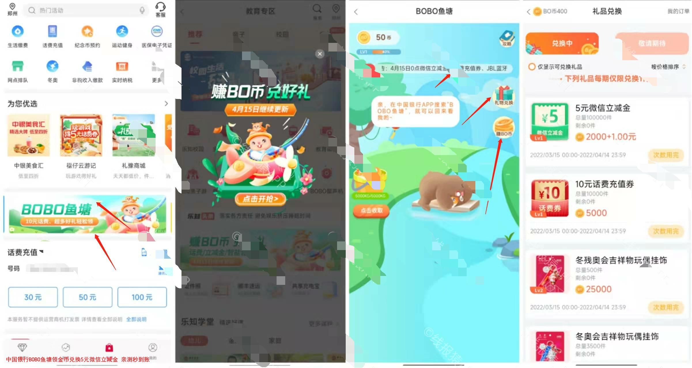 中国银行BOBO鱼塘领金币兑换5元微信立减金 亲测秒到账