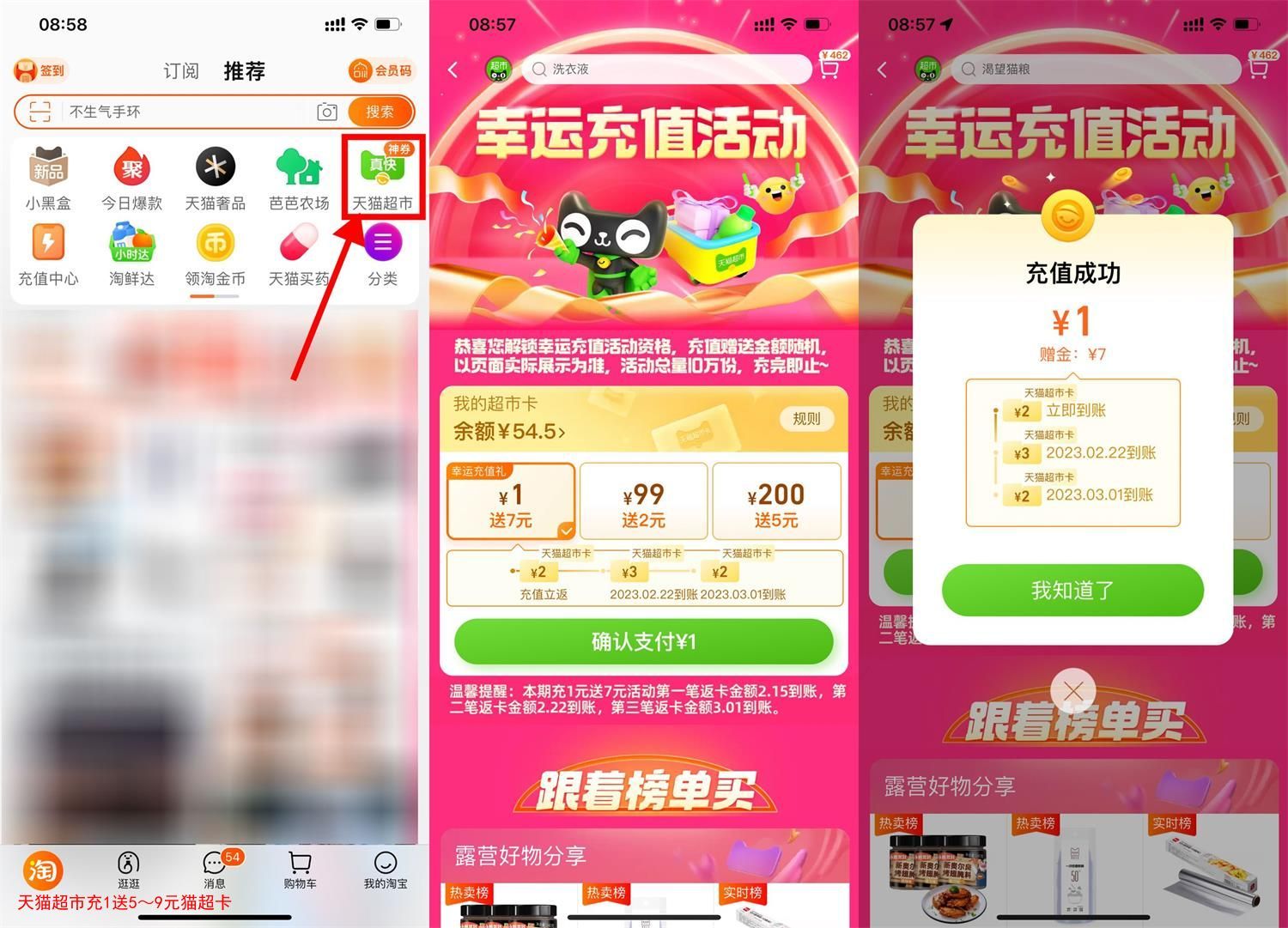 淘宝首页“天猫超市”->搜索“幸运充值”->充1元猫超卡额外送3张天猫超市卡(每个人显示的都不一样)每周自动到账一张