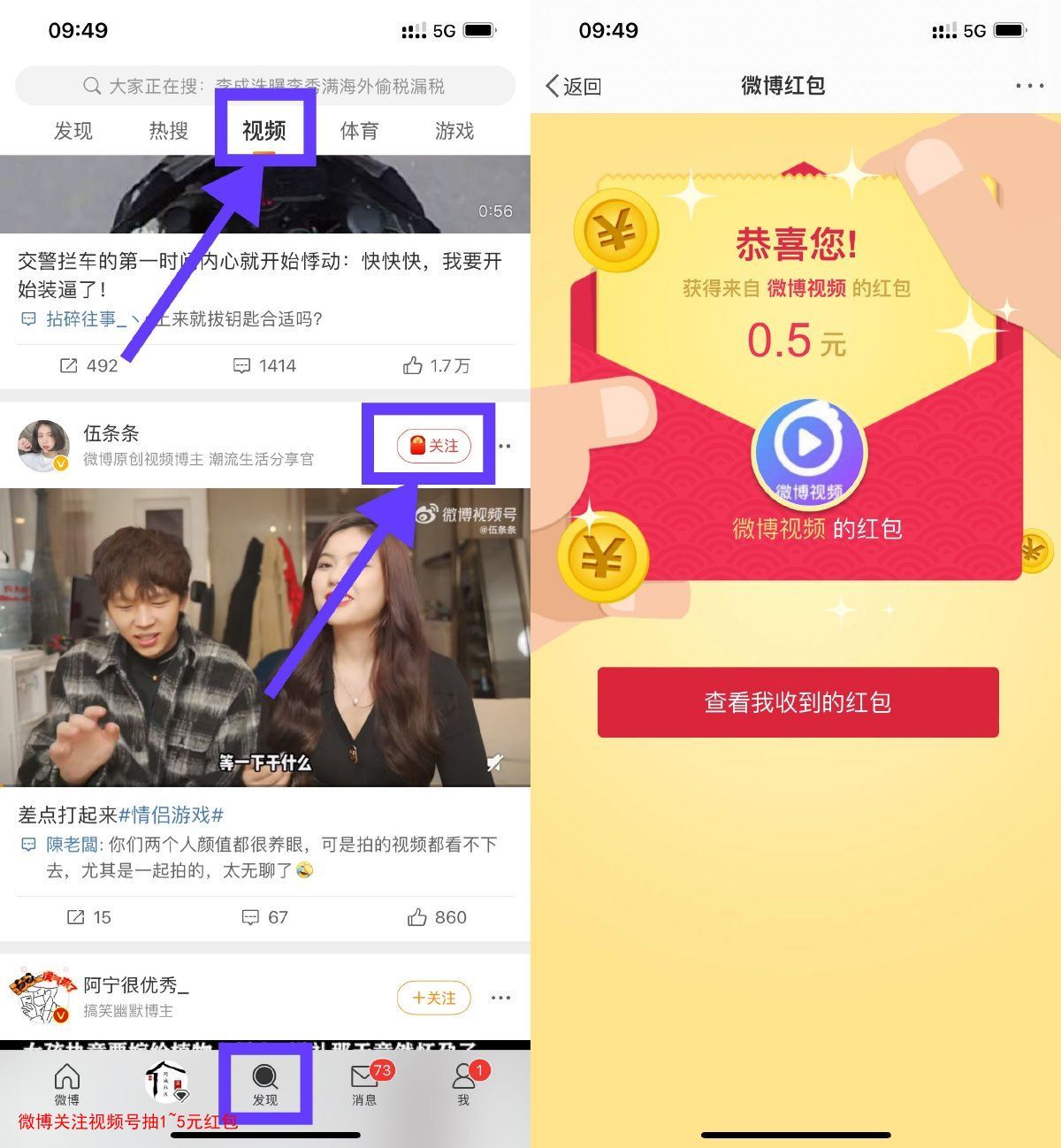 1、打开微博APP->底部“发现”->顶部“视频”->显示有红包标志的就关注->多关注点
