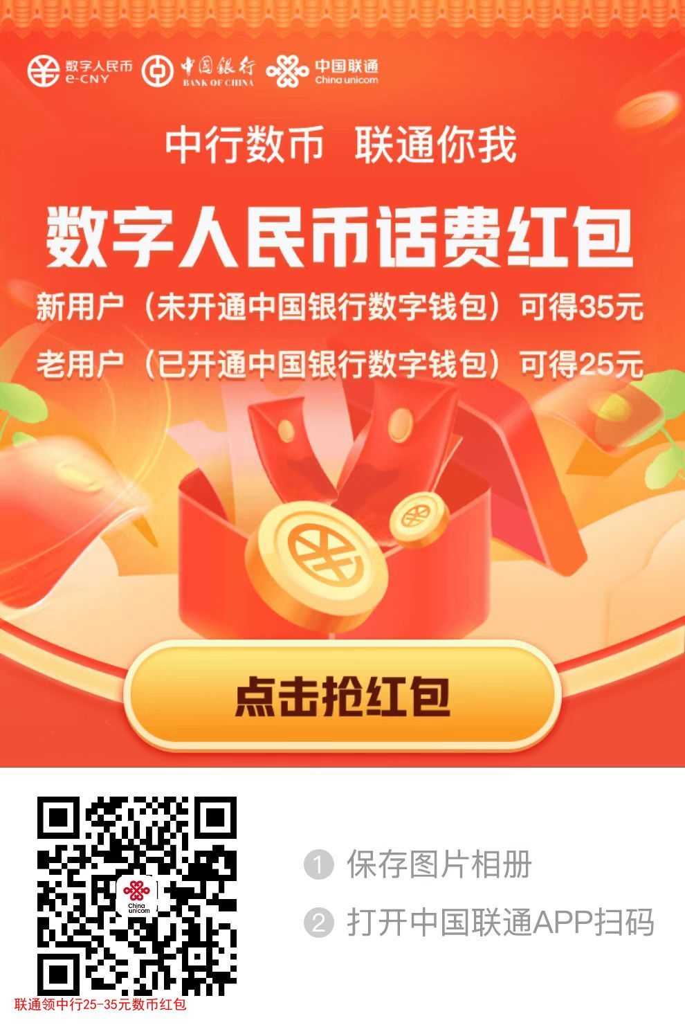 联通手机号用户,领中国银行数字人民币钱包,联通App破定位到数字人民币试点城市,新户领35元老用户领25数字人民币红包。可充联通话费。老用户也可以注销再去领,(中行的尽量少注销)自己看哈——————