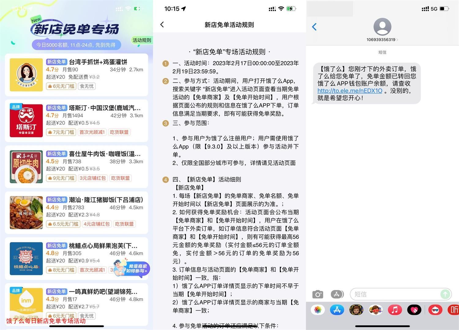 饿了么APP搜索“新店免单”进入->活动页面标题下方写着今日免单名额和免单时间(今天是5000个名额,11点整开始,大概2秒左右抢完!)只有送达了才知道自己有没有免单,免单有短信通知