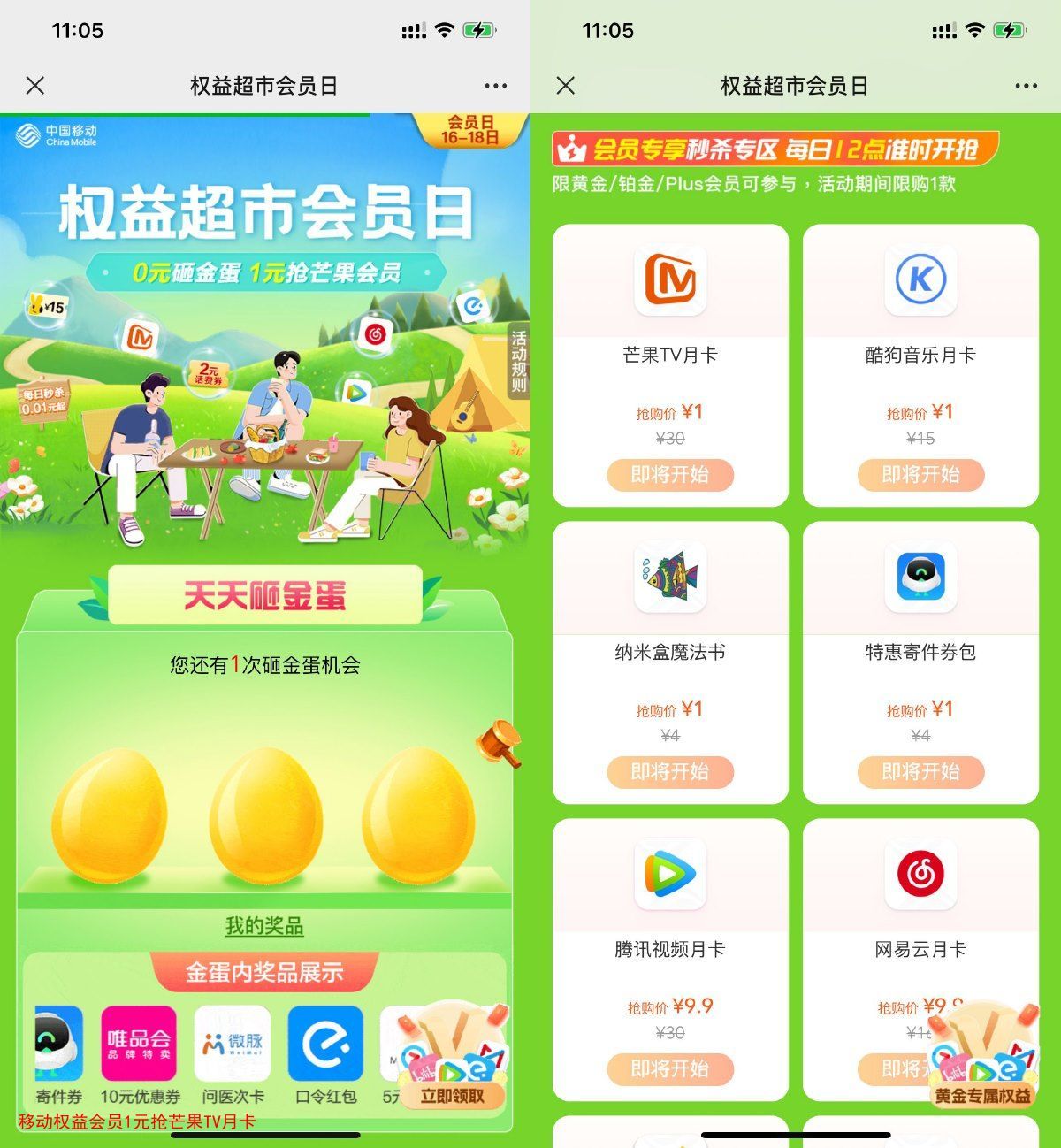 打开地址->每天砸蛋抽个随机权益->12点整1元抢芒果TV、酷狗音乐月卡等,直充秒到