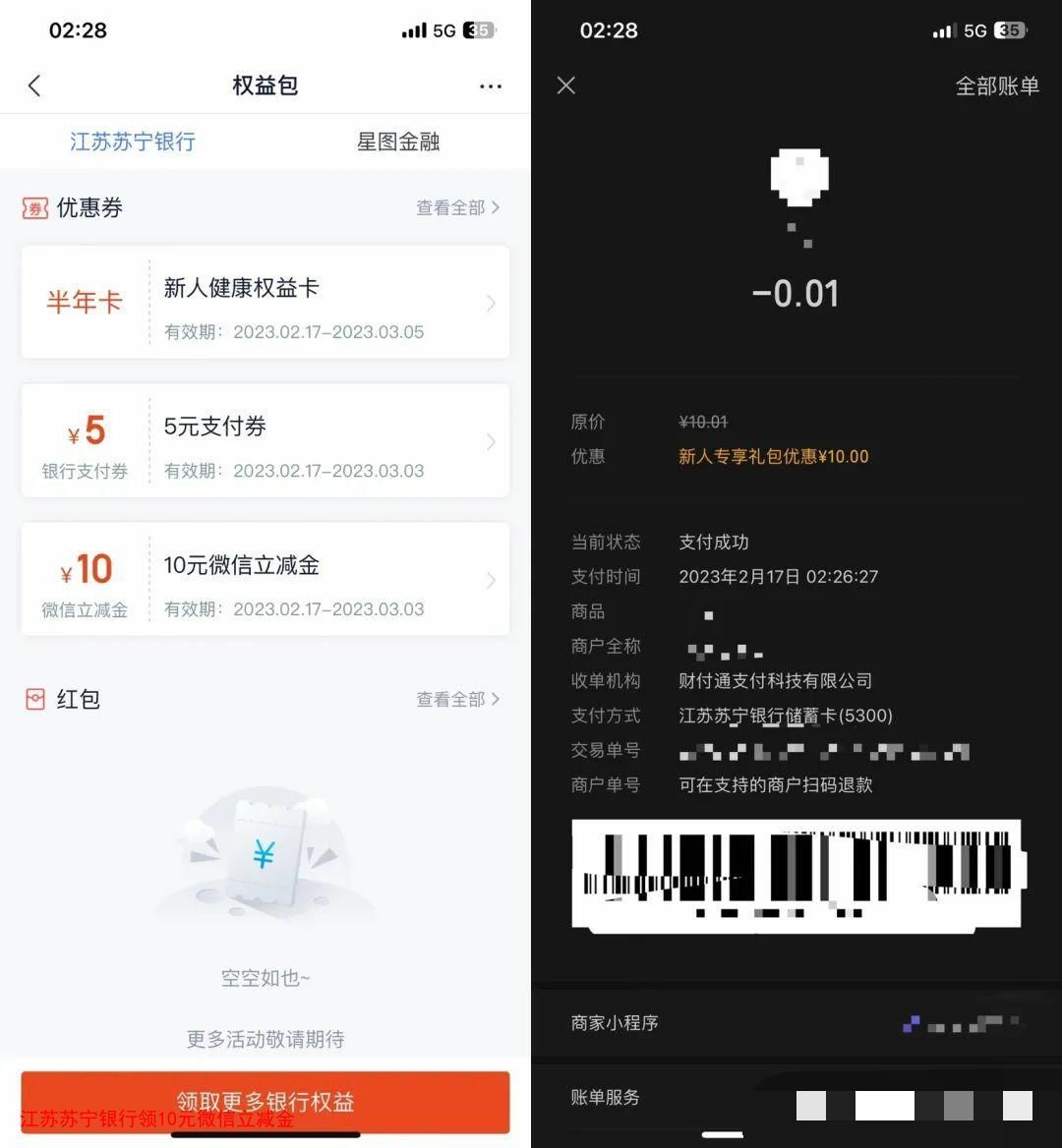 应用商店下载“江苏苏宁银行APP”->注册之后开户->开户成功->我的->权益包->领5元支付优惠券+10元微信立减金亲测->由于部分界面无法截图->请大家谅解