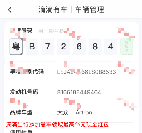 滴滴出行小程序里面随便添加一辆车可以获得最高66元现金