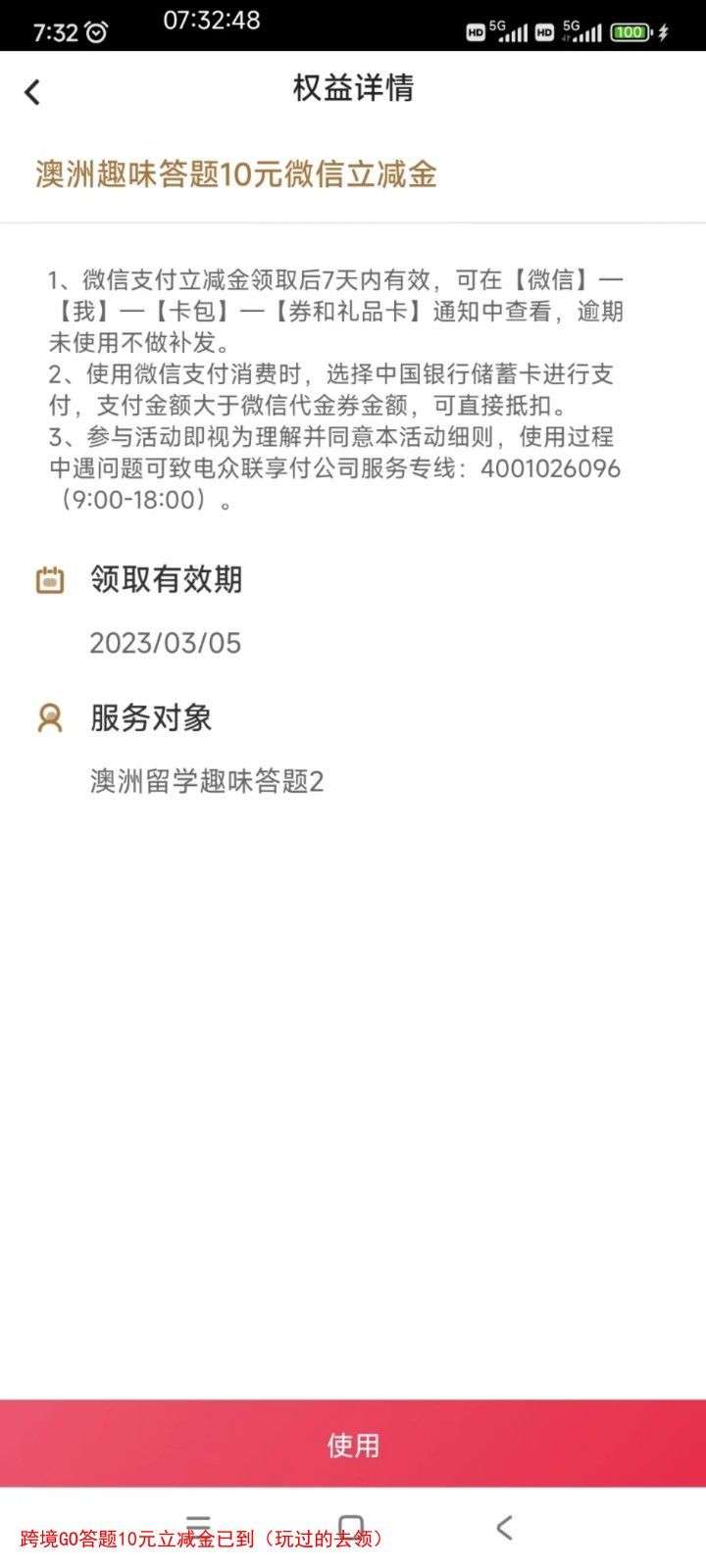 玩过中银跨境GO澳洲答题的,10元立减金已到。中国银行App我的权益里领取。没玩过的,等下一期活动。