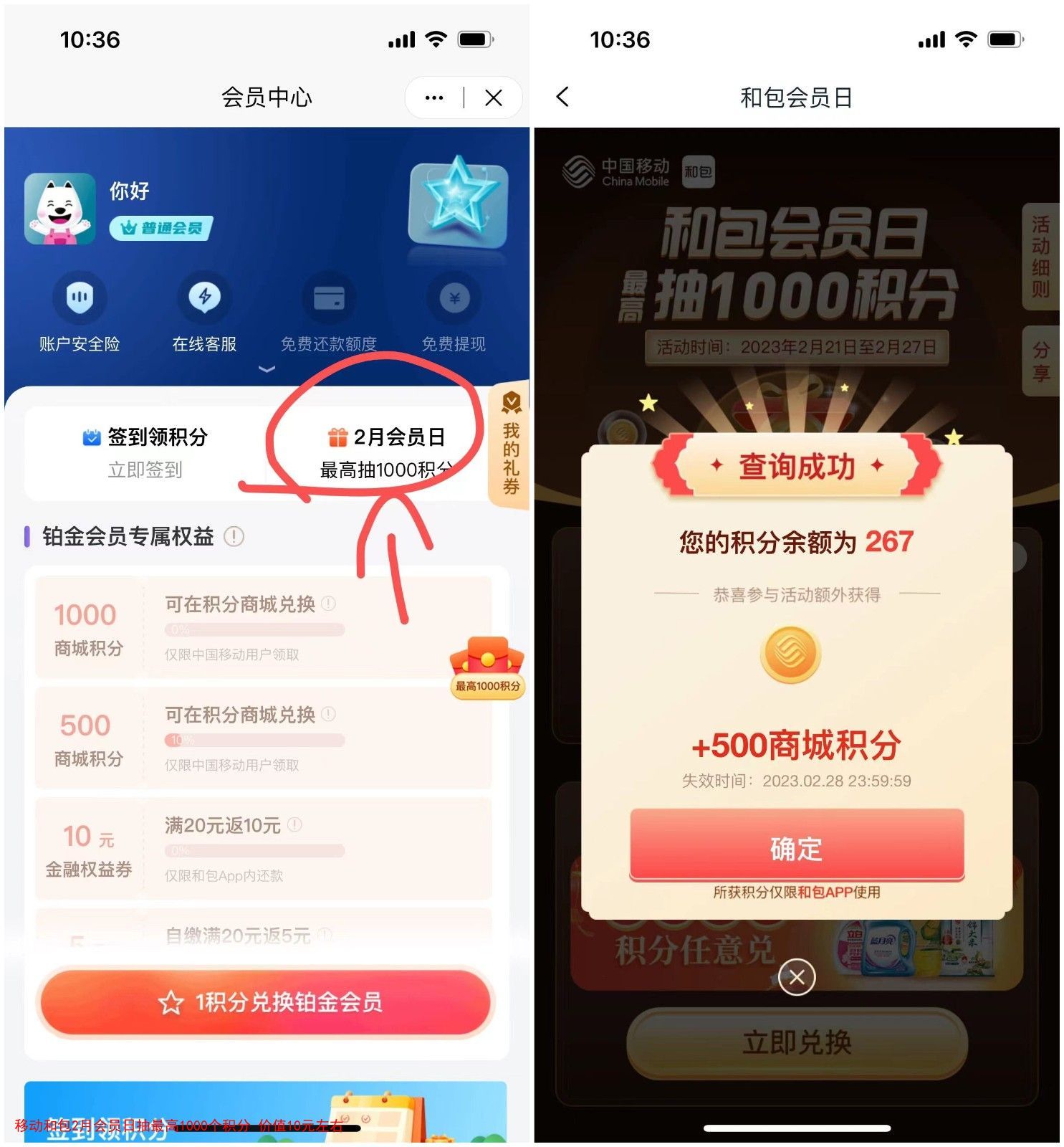 移动和包2月会员日抽最高1000个积分 价值10元左右