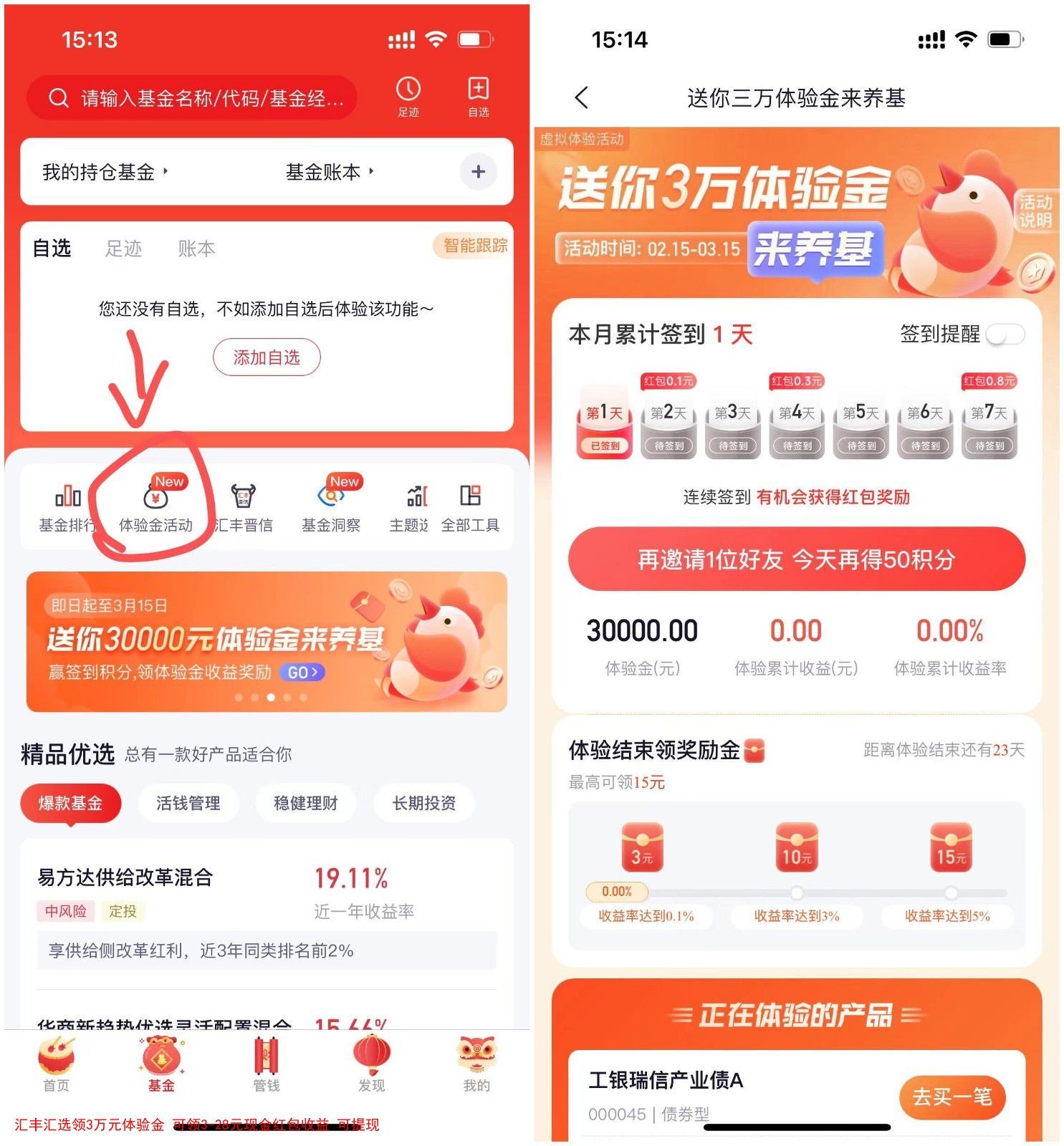 参加汇丰汇选举办的送你三万体验金来养基活动,通过打卡汇丰汇选APP进去活动里,选择3只基金后就可以领到3万元体验金,在体验金收益率达到0.1%可领取3元现金红包、收益率达到3%可领取10元现金红包、收益率达到5%可领15元现金红包,这个现金红包可以提现。
