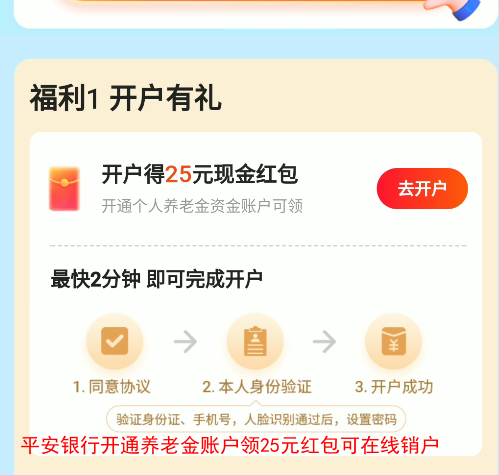 符合个人养老金资金账户开通政策条件的平安口袋银行APP客户。除在平安集团其他个人养老金资金账户活动开户的客户,此活动奖励与平安集团内其他个人养老金资金账户活动奖励不同享,包括但不限于平安口袋银行还款金渠道、惠花会存赚养老礼金活动,平安集团壹钱包、金管家、平安好车主等,通过以上渠道/活动开户则不再具有此活动开户福利领取资格。(1)奖励为25元现金红包一个,每位客户仅可领取1次,需在活动页面点击领取,领取有效期为2023年2月28日及以前,过期将无法领取。数量有限,发完即止。