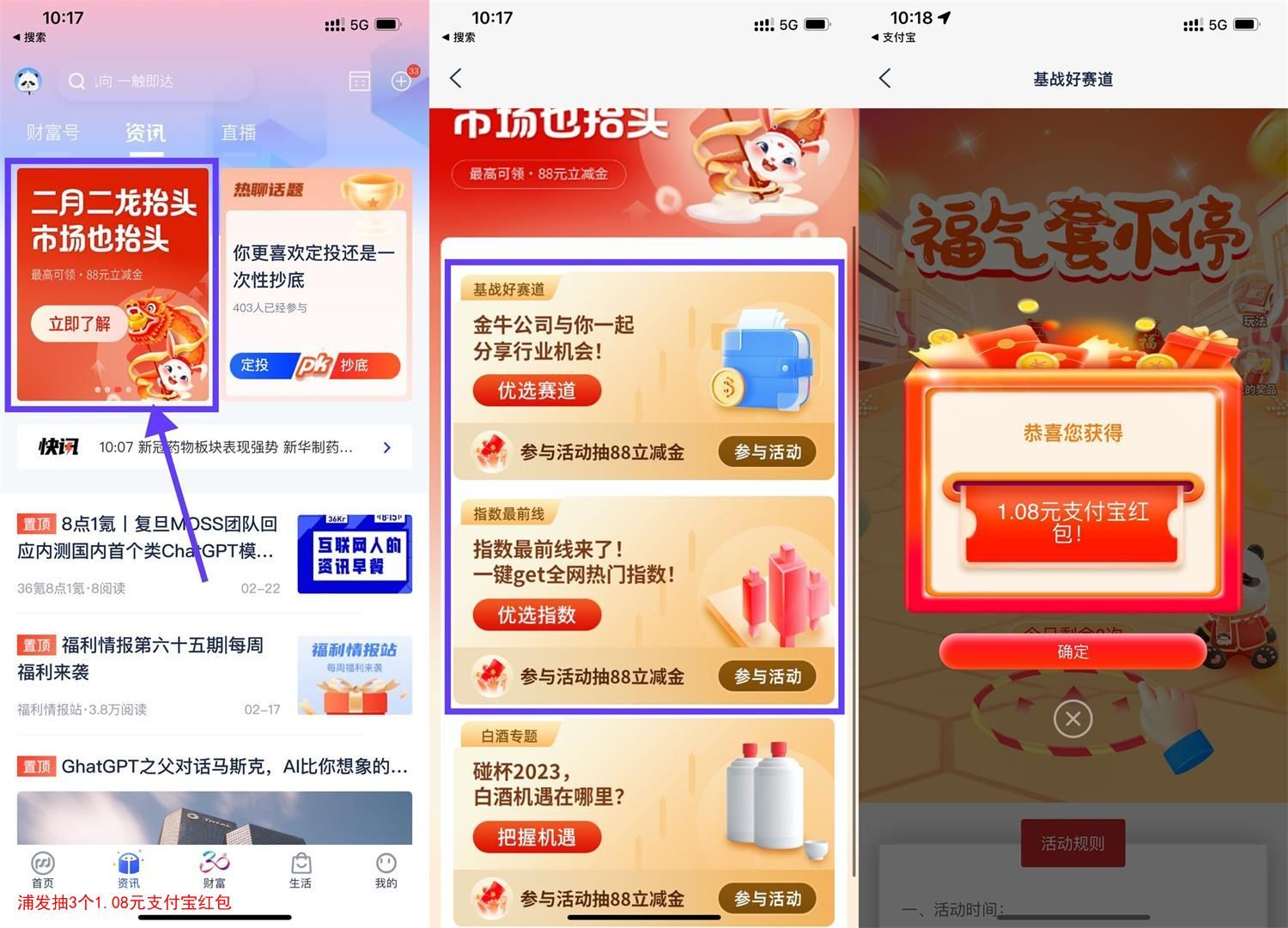浦发银行APP底部“资讯”->二月二龙抬头->点击前三个活动进入直接抽1.08元支付宝消费红包