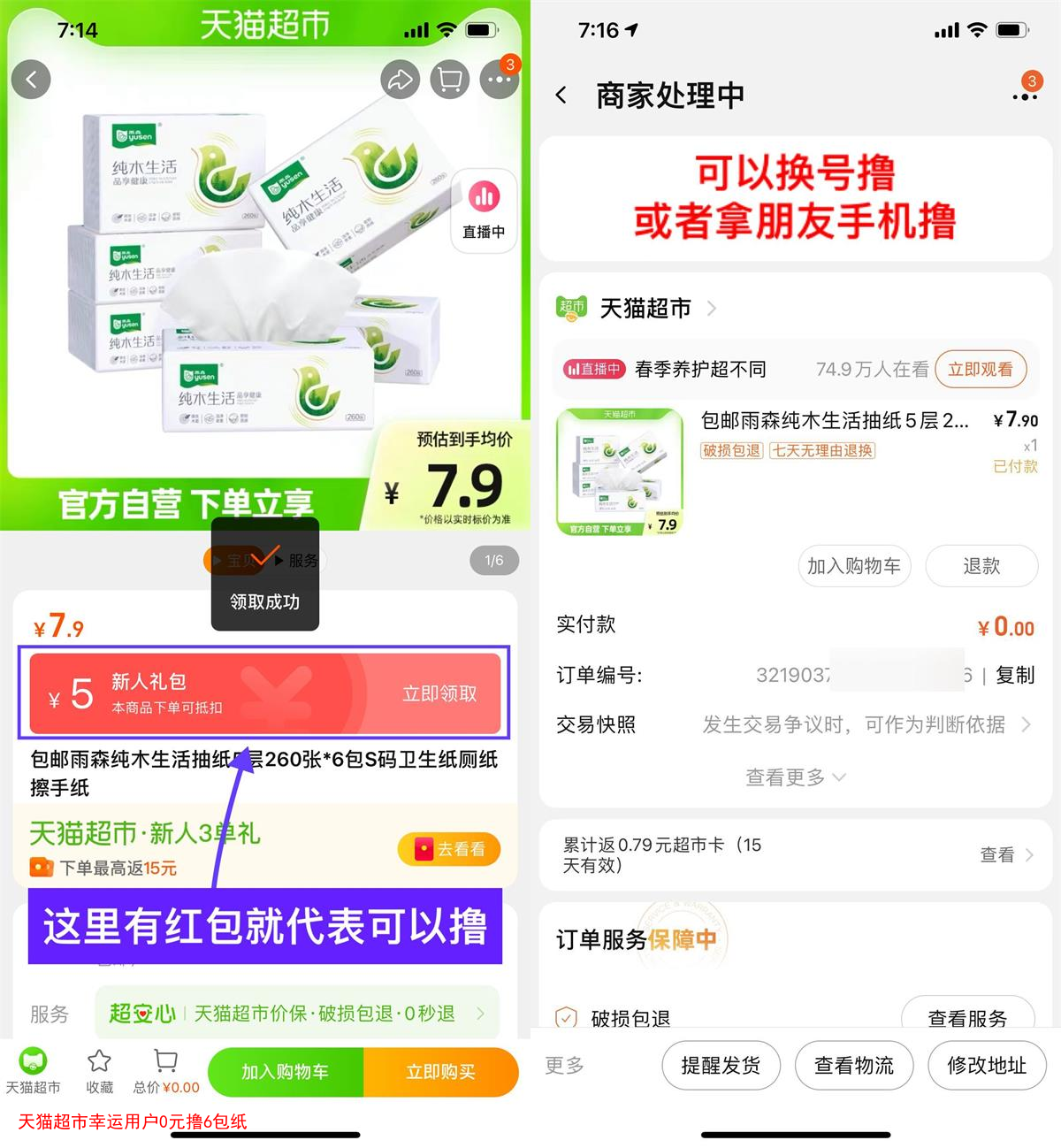 天猫超市幸运用户0元撸6包纸