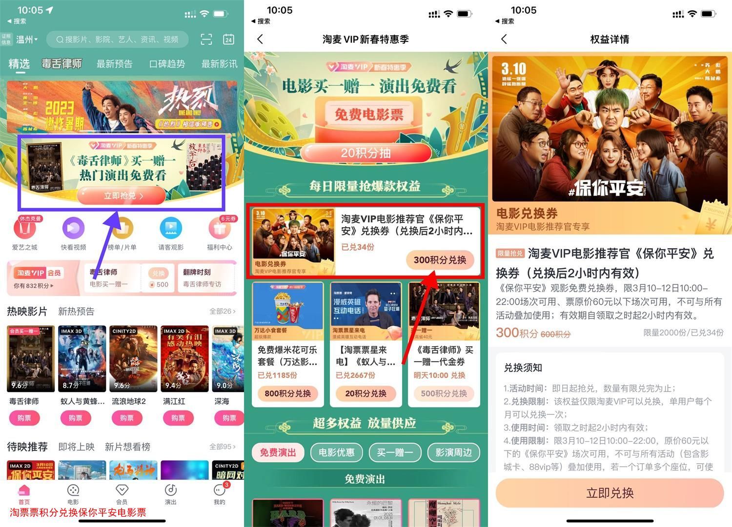 淘票票APP首页“立即抢兑”->使用300积分兑换->兑换后在2小时内选座购买即可