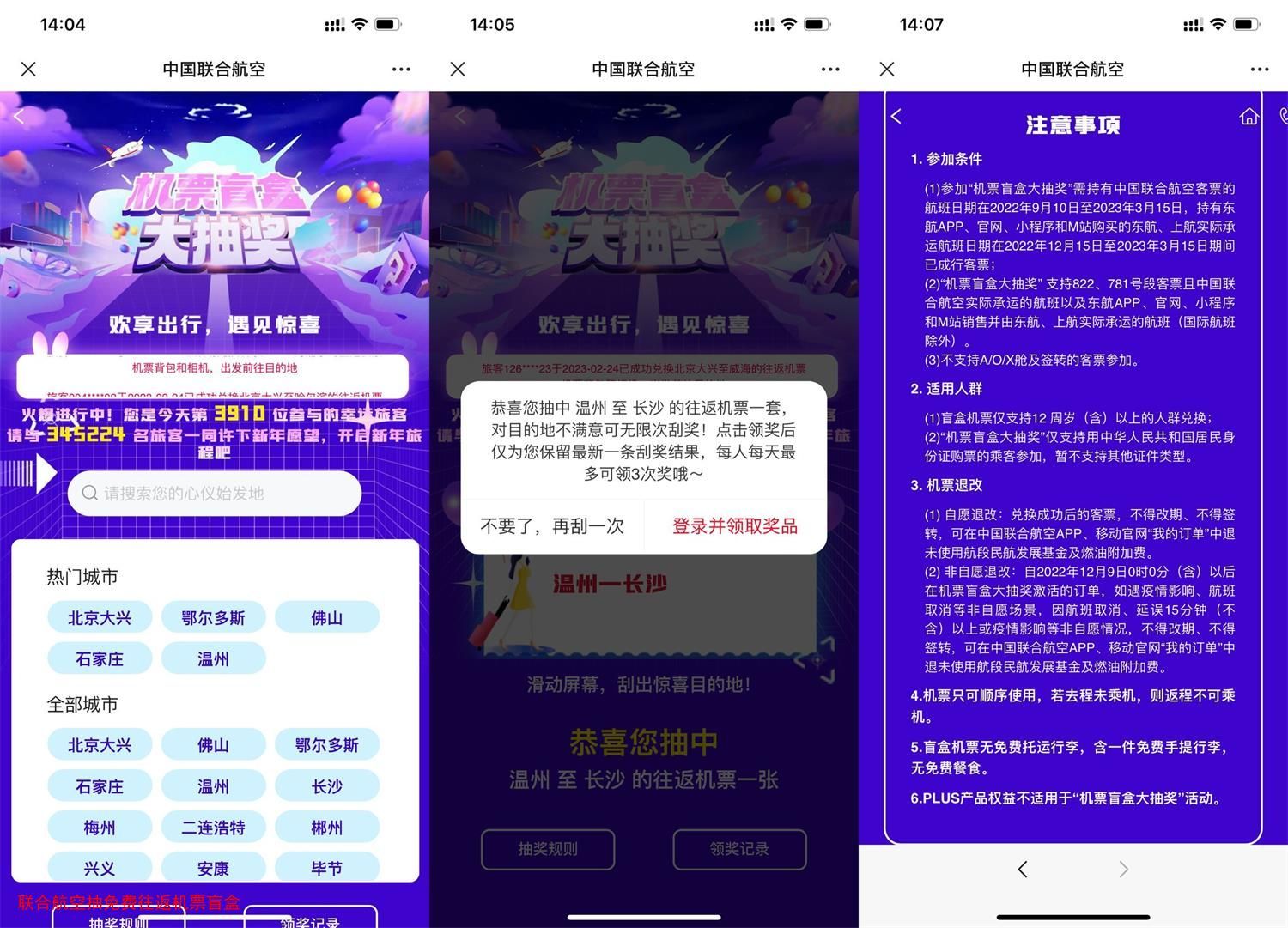 微信关注公众号“中国联合航空”->菜单栏“盲盒抽奖”第一个进入->选择始发地和目的地抽免费往返机票(只需付机建燃油费)