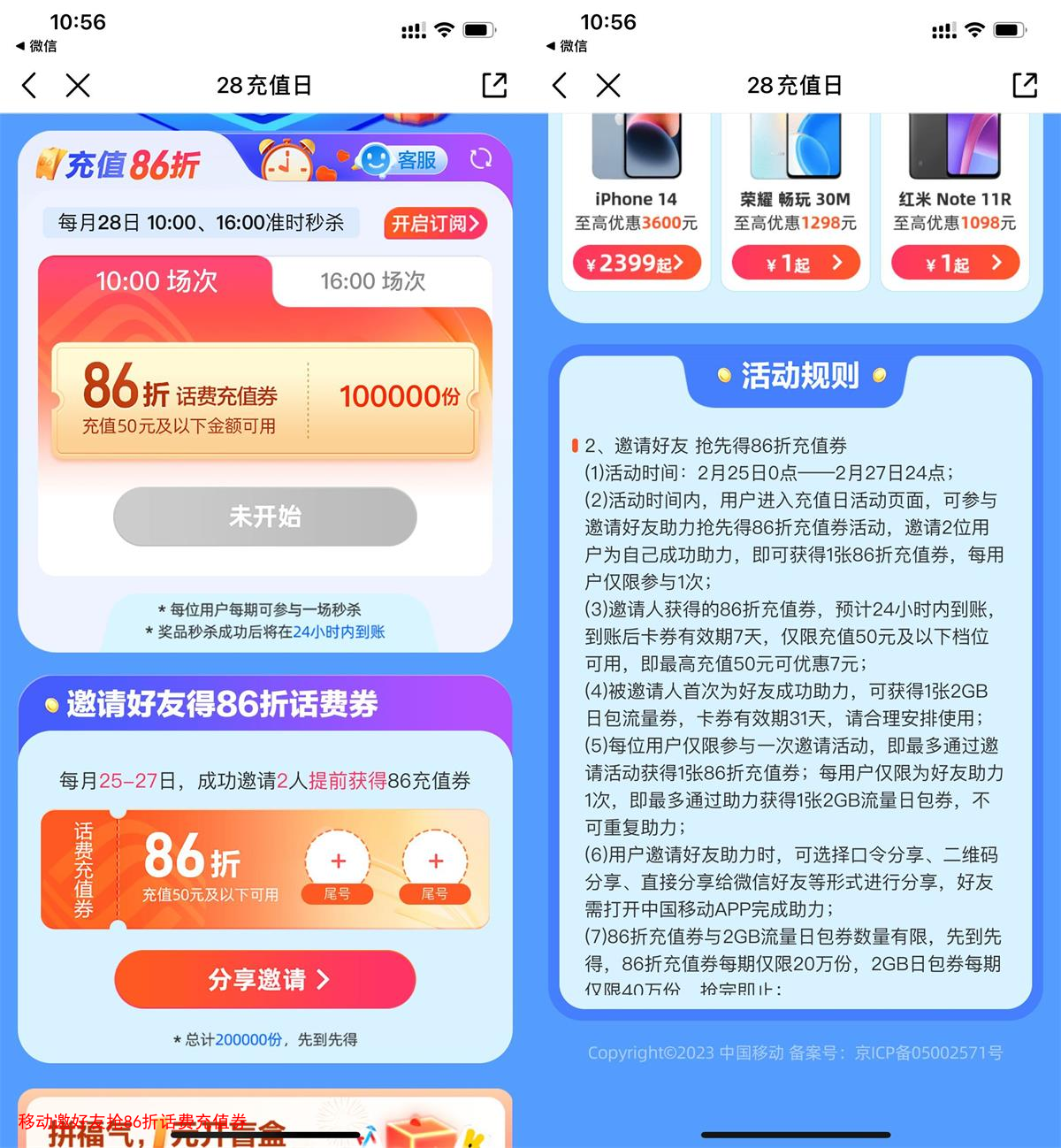 中国移动APP首页横幅进入->邀请2个好友助力提早抢86折话费充值券->或2月28日10点、16点抢86折话费券,各限量20万份