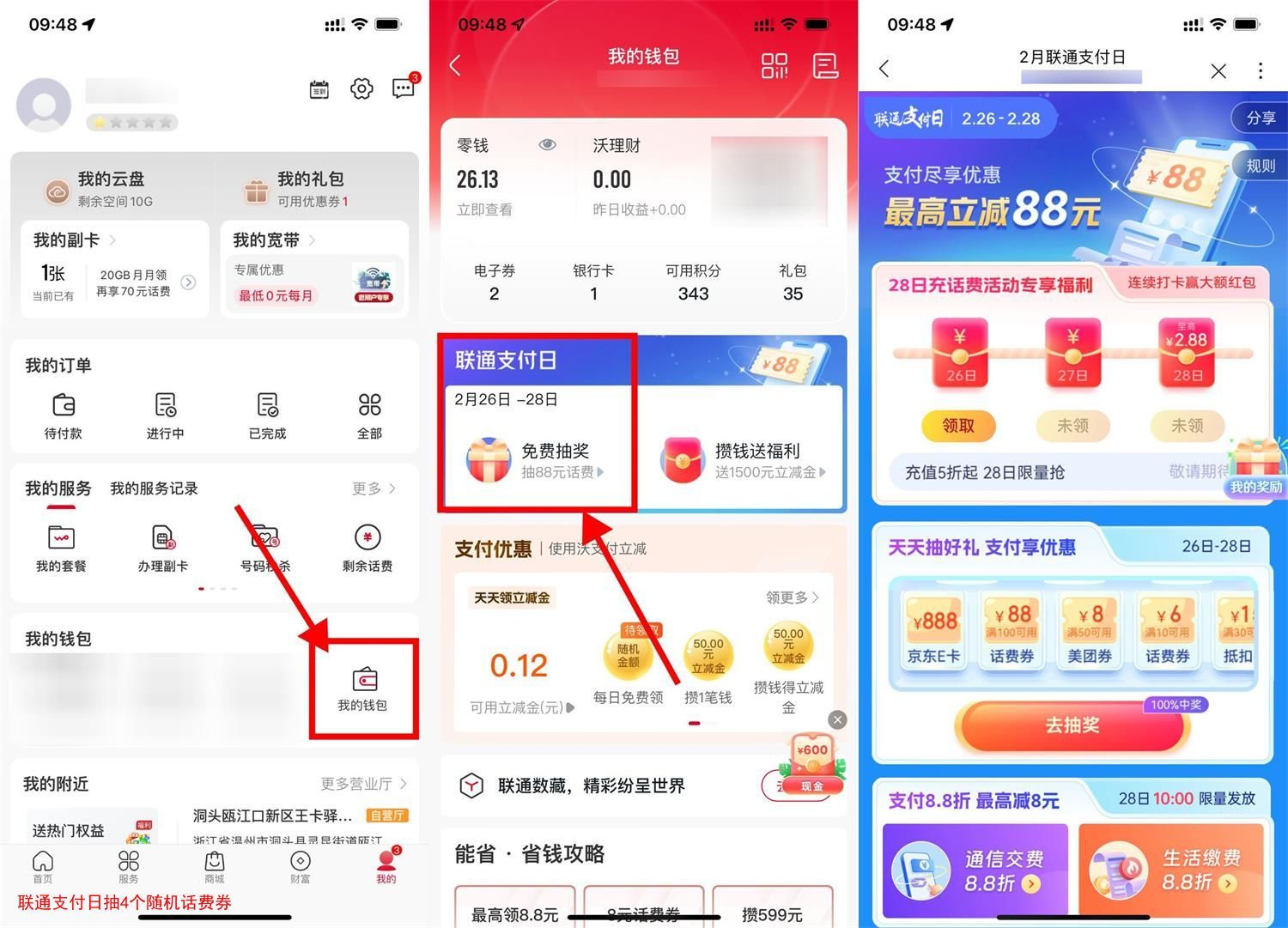 1、联通APP->我的->我的钱包->联通支付日->每天签到抽随机话费券