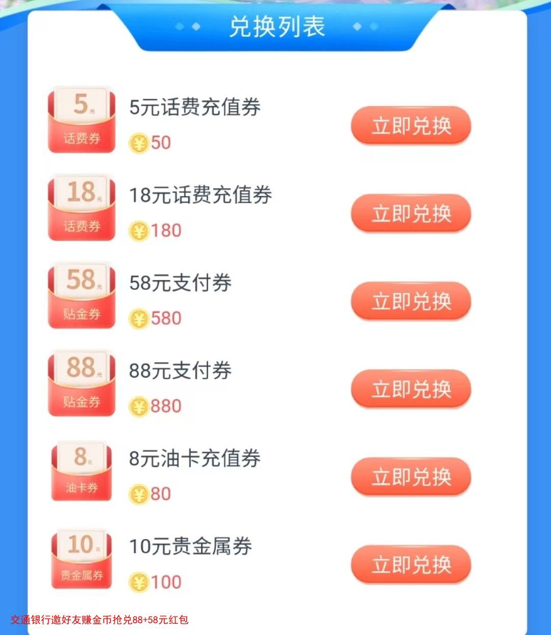 交通银行邀好友赚金币抢兑88+58元红包