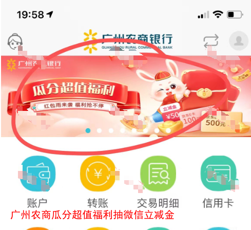 广州农商银行APP在首页顶部“瓜分超值福利”进入参与一次抽奖,分享好友额外获得2次游戏次数,总3次
