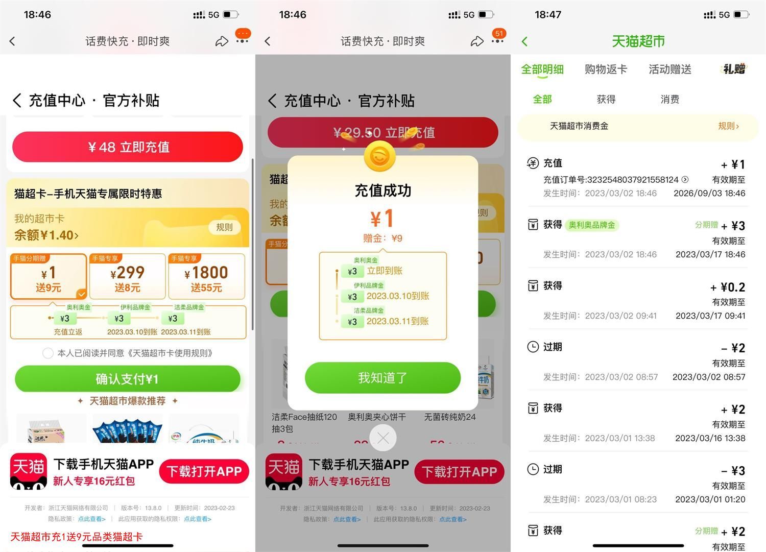 淘宝APP扫码->下拉充1元猫超卡送3+3+3元品类猫超卡,品类猫超卡等过期后找客服可以补成通用猫超卡