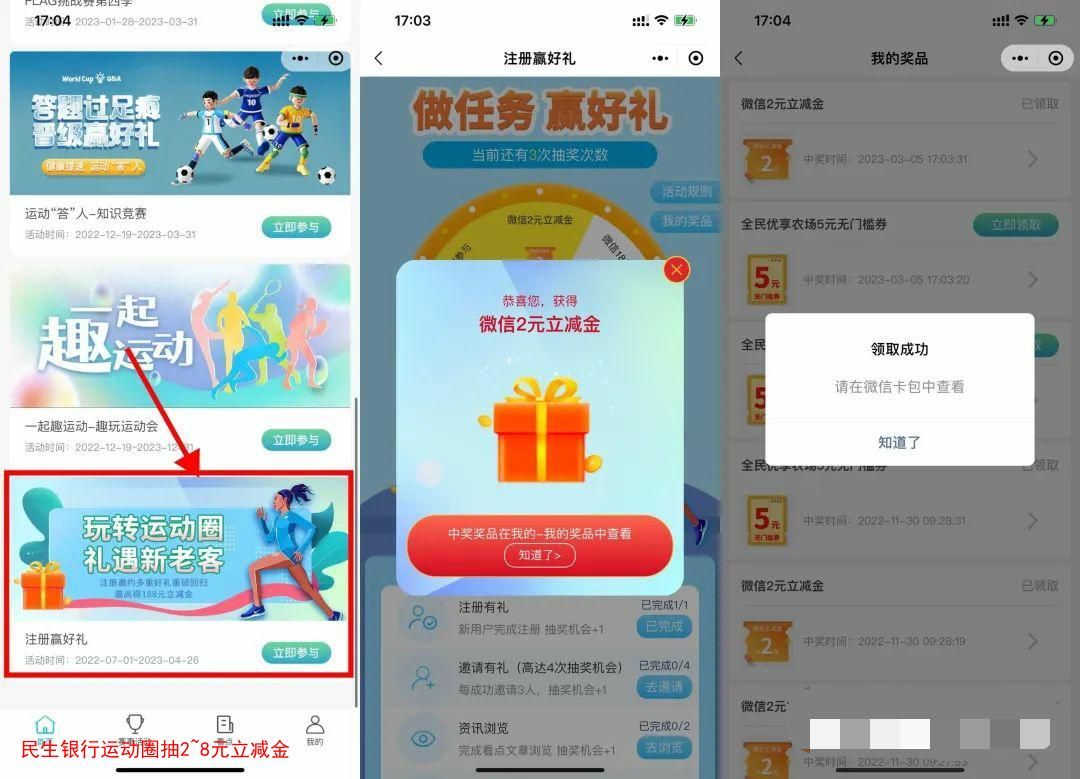 微信进入小程序“民生银行运动圈”->下拉简单浏览得次数->抽2~8元微信立减金